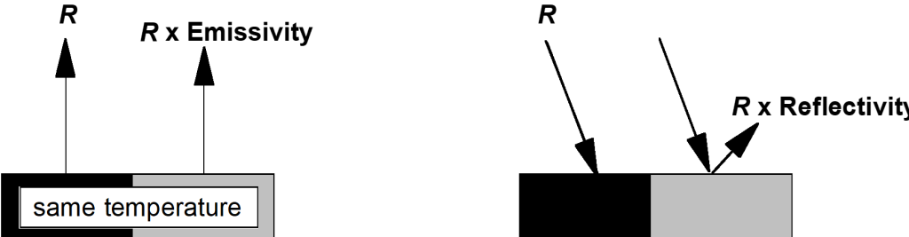 Emissividade ($\varepsilon$): razão entre a radiação emitida pela superfície e a de um corpo negro à mesma temperatura (superfícies naturais: 0,95–0,99).